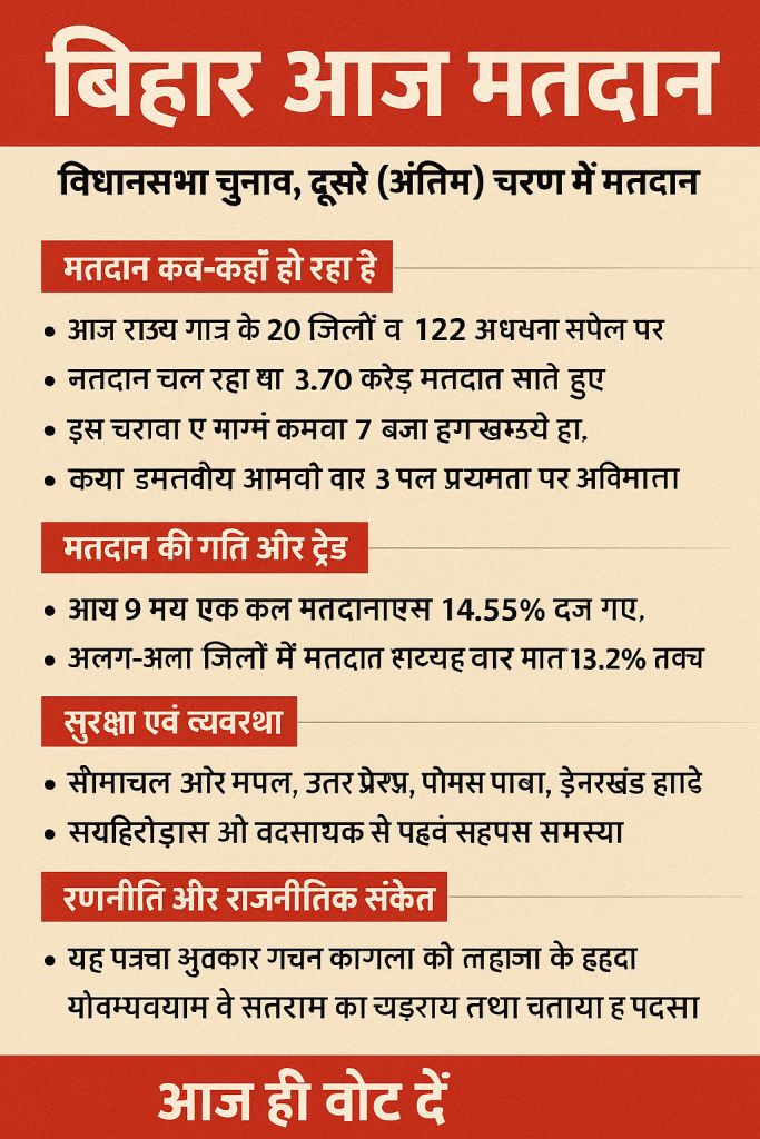 आज राज्य के 20 जिलों में 122 विधानसभा सीटों पर मतदान चल रहा है। इस चरण में लगभग 3.70 करोड़ मतदाता तथा 1,302 उम्मीदवार शामिल